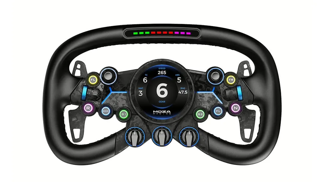 But what really makes the MOZA Vision GS stand out is its functionality. It comes with a 4.3-inch built-in digital dashboard, giving you live telemetry like speed, RPM, gear, and more—so you can keep your eyes on the track instead of juggling HUDs. With 10 illuminated mechanical buttons, 5 rotary encoders, and thumb dials, you’ll have full control of your car’s setup without ever leaving the wheel.